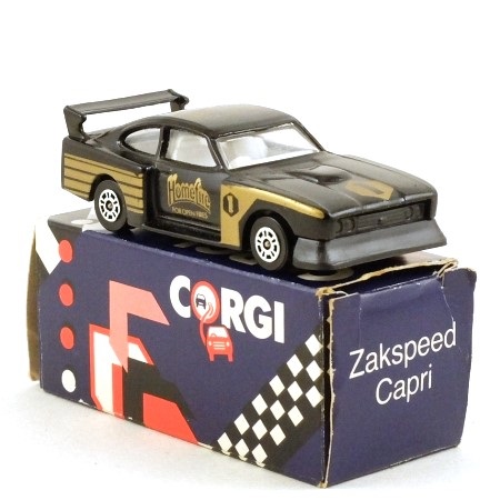 Black with white interior. Gold tampo prints: side stripes, 'Homefire' logo and racing number 1 graphics. The wheels have a twin-spoke silver design. Dark blue box with white, red and black graphics.