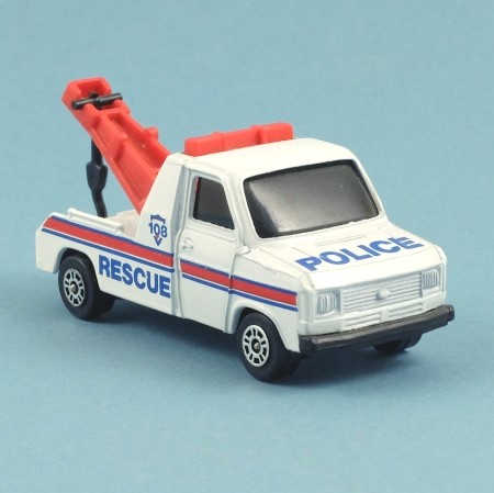 White, with black plastic base, red plastic crane jib and roof light bar, black plastic hook. The jib can be lowered and raised again by spring action. 'POLICE' on the bonnet in blue, red stripe with blue border on the sides with 'RESCUE' and '108' graphics. Black wheels with silver 5 twin-spoke hub detail.