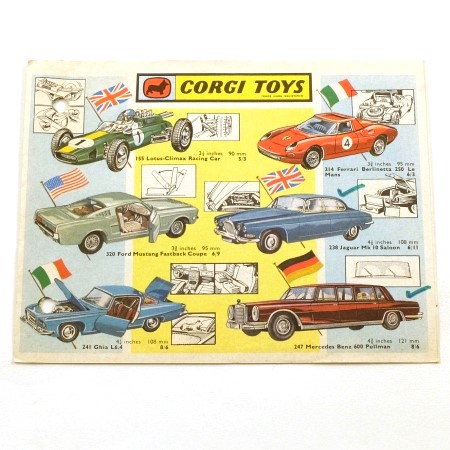 Fold-out leaflet/catalogue depicting the Corgi range of vehicles and incorporating a Collector's Check List, the first one Corgi produced. One side is full colour, the other in shades of grey on a pink background.