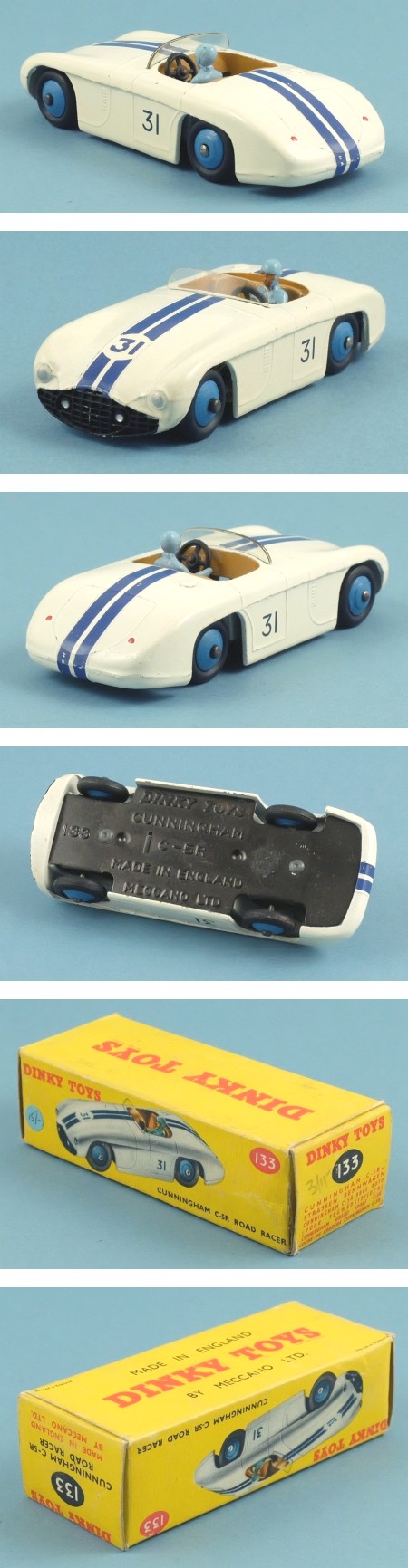 This is a model of the only Cunningham C-5R racing car ever built, and which enjoyed some success at Le Mans and elsewhere. Finished in off-white with black grille, brown interior and dark blue racing stripes with racing numbers 31 on the bonnet and doors. Silver headlights and red rear lights. The driver has blue racing overalls and helmet. The base is mottled black tinplate and the wheels are blue with smooth black tyres.