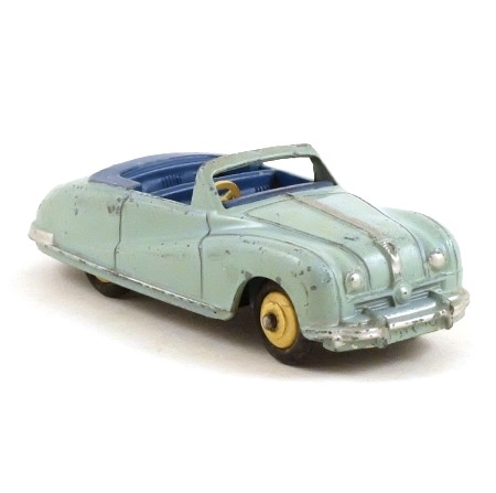 This one is in fair-to-good condition, with general light paint chipping and some larger chips on the folded hood. There are traces of handwritten number plates! The baseplate has some light corrosion, and the tyres have hardened with age but have retained their shape. This Dinky model was renumbered to 106 in 1954.