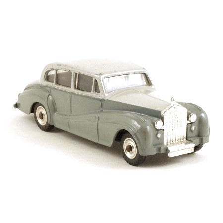 Two-tone grey, chrome plated metal bumpers and grille, red painted rear lights. Black base, clear windows. The wheels are shaped spun metal with black tyres and suspension.