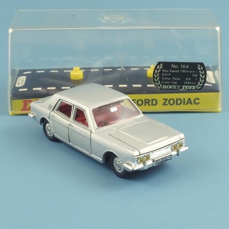 This Dinky model is packed with features! In silver with red interior and charcoal base, it is unusual because all 4 doors open. This was achieved by eliminating the model's 'B' pillar and using the front seats to shroud the rear door hinges; the result is very effective. In addition to this the model has an opening bonnet with silver plated engine and spare wheel, and an opening boot. The bumpers and grille are silver plated and there are jewelled lights front and rear: twin headlamps and red and yellow rear lamps. The wheels are cast metal with black tyres, suspension and 'Prestomatic' fingertip steering.