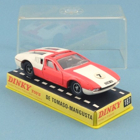 Bright orange-pink, with white engine covers, bonnet and base, bronze engine and exhausts, black interior with silver steering wheel. Black grille with silver headlights. Opening twin rear engine covers, detailed engine. Opening bonnet with racing number 7 and '7238-GE' licence plate. Wheels are 5-spoke metal 'alloy' with black tyres.