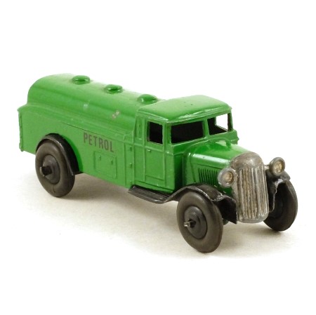 Green, with black open chassis and mudguards, and diecast radiator and headlamps. 'PETROL' decals on the sides. This is an early post-war issue with black ridged wheels.