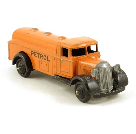 Orange, with black type 4 closed cast chassis and mudguards, with front bumper. Diecast radiator and headlamps. 'PETROL' on the sides in black, and a '20' plate on the rear. Black ridged wheels.