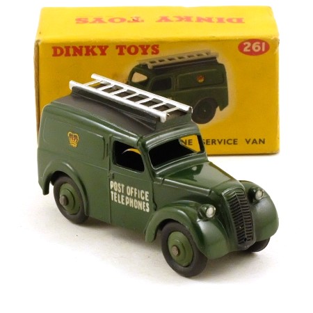 This Morris Z series van was once a familiar sight on the roads of Britain, in the days when the Post Office ran the telephone network. In dark green with matt black roof and grille and black tinplate base. On the roof is mounted a silver tinplate ladder. There are 'Post Office Telephones' decals on the cab doors in white and a royal crest on the sides in black, gold and red. The wheels are a slightly lighter shade of green and have smooth black tyres.