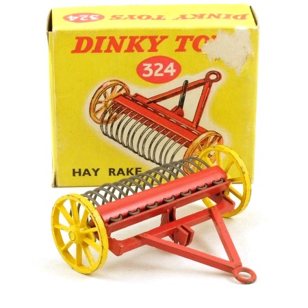 This hay rake has a red frame with unpainted wire tines and yellow metal spoked wheels. Designed to be towed by a Dinky tractor. The pre-1954 catalogue number 27K is cast on the underside of the frame.