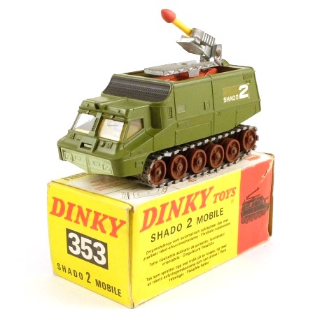 The Dinky model, which is satisfyingly heavy, is finished in green with yellow interior and pale green base, and the roof has an orange underside. The tracks are silver, on brown rollers. There are 'Shado 2' labels on each side of the body.