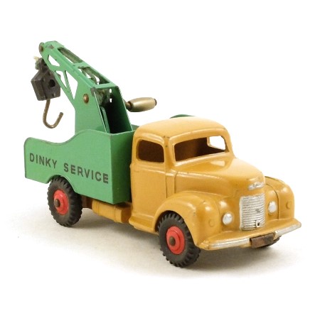 Tan cab and chassis with silver grille, headlights and bumper. Mid green rear body, with black 'DINKY SERVICE' lettering on the sides Black tinplate base. This is an early version with red metal wheel hubs and treaded tyres. The crane hook can be wound up and down by turning the handle at the side.