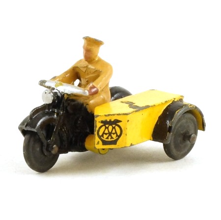 Black motorcycle with silver headlight and handlebars, tan rider with brown gloves. Yellow sidecar with black mudguard. 7mm 'AA' (Automobile Association) emblem in black on the sidecar. Wheels are solid black rubber.
