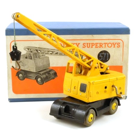 Orangey-yellow, black chassis. Silver lights and black air intake. Operating crane controlled by two corded handles: one raises and lowers the jib, the other hoists the weighted hook up and down. The body of the crane rotates (or slews to use the correct term!) on the chassis and the cab features a detailed driver. Yellow cast ridged wheels with grey tyres.