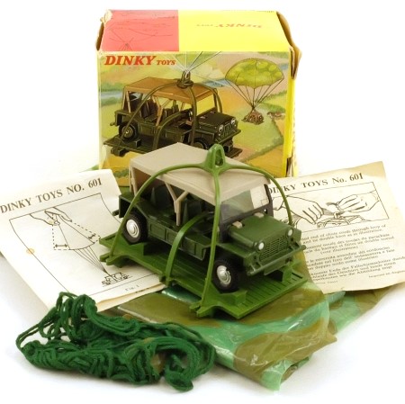 This unusual model consists of the standard Dinky Mini-Moke in military green, with a working parachute which allows it to be thrown into the air and to gently float down to the ground. That's the theory, anyway. The Mini-Moke has a detachable light grey-brown canopy, spare tyre and opening bonnet with detailed engine. For parachuting purposes it is securely strapped to a plastic 'assault platform' which in turn is attached to the parachute.