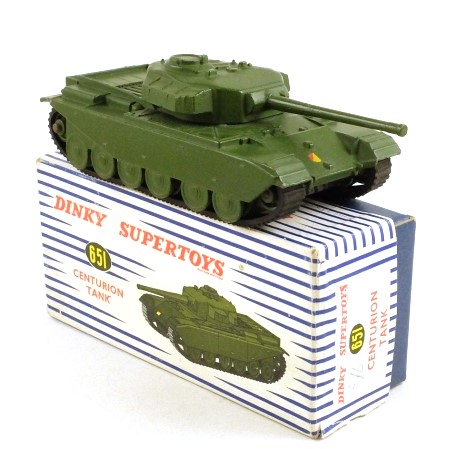In very good condition, with a nice straight barrel and only a couple of small paint chips. There is some loss from one decal. The tracks are very well preserved, although would benefit from some cleaning, and there is some scuffing on the base. The lidded 'DINKY SUPERTOYS' box is complete with one packing piece. There is some rust on the staples and a label on the inside of the lid, but otherwise it is excellent. A price of 8/6 (eight shillings and sixpence) is written on top one end.