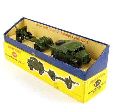 This set consists of 688 Field Artillery Tractor, 687 Gun Limber, and 686 25-pounder field gun, all in military green. The tractor has a spare wheel and driver figure, and small square red and blue Royal Artillery markings on the front and rear. The elevation of the gun barrel may be adjusted. The wheels on all vehicles have cast ridged hubs with black treaded tyres.