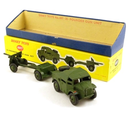 This set consists of 688 Field Artillery Tractor, 687 Gun Limber, and 686 25-pounder field gun, all in military green. The tractor has a spare wheel and driver figure, and small square red and blue Royal Artillery markings on the front and rear. The elevation of the gun barrel may be adjusted. The wheels on all vehicles have cast ridged hubs with black treaded tyres.