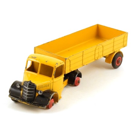 This articulated lorry is in deep yellow with black wings and radiator, and with silver trim on the grille and headlights. The trailer has a tow hook and '20' decal on the tailboard in white on a black background. The wheels are red cast metal; ridged with smooth tyres on the tractor and Supertoys hubs with treaded tyres on the trailer, which is correct for this model.