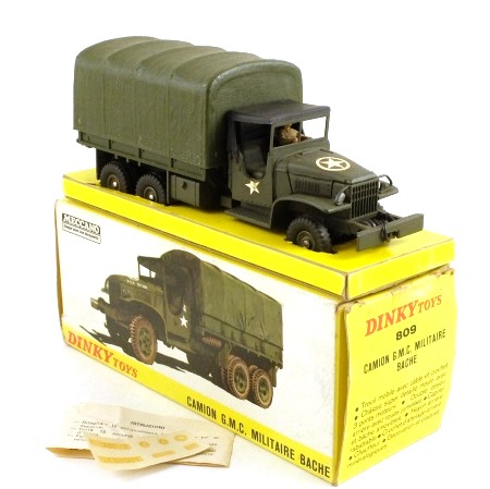 Military olive drab, black base and driveshafts. White stars on the bonnet and cab doors, silver headlights and red rear lights. The cab has a black plastic roof and a driver figure. Working front winch. Removable plastic rear tilt, drop-down tailboard and tow hook. Matching olive green metal wheels with black tyres, double at the rear.