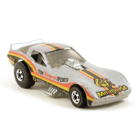 Metallic grey, with unpainted metal chassis and smoked grey windows. Black, orange and yellow stripes on the roof and bonnet with 'Mongoose' logo. Similar stripes on the sides with 'Tom Mongoose McEwen' and various sponsor logos. Flip-up body reveals the engine, seat and roll cage. Standard black wheels with silver centre design. Hong Kong casting.