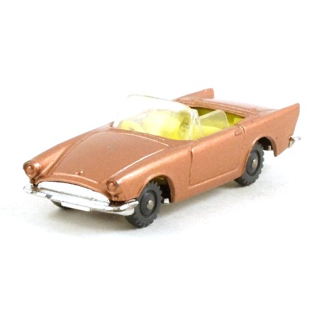 This pretty little model sports car is finished in metallic bronze with yellow interior and clear plastic windscreen. The base, bumpers and grille are silver plated and the wheels are dark grey with suspension, as with all early Husky models.
