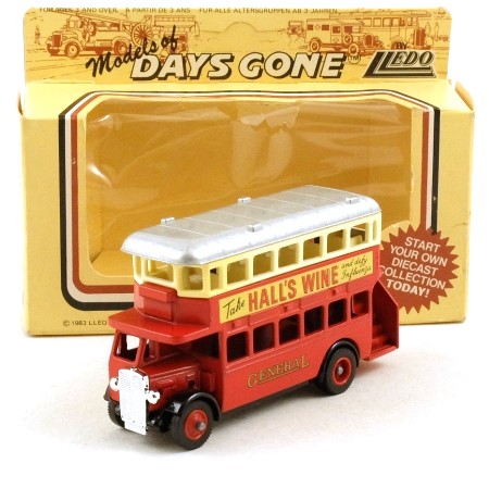 Red with cream upper deck windows and seats, silver roof, black base and mudguards and chrome plated grille and headlights. 'GENERAL' on the lower deck sides in gold lettering with black outline. 'Halls Wine' adverts on the upper deck sides. The wheels are matching red, double at the rear, with black tyres.
