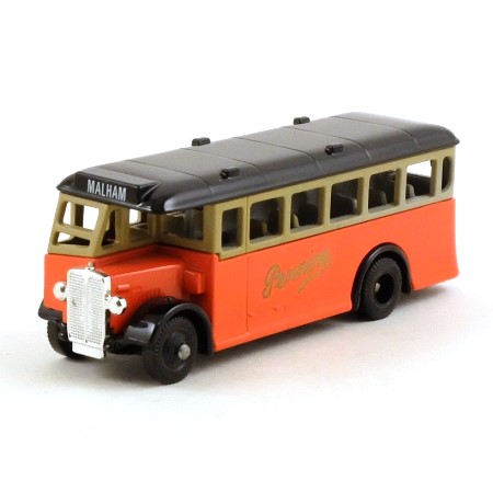 Orange, with black mudguards, base and roof, and grey windows and seats. 'Pennine' on the sides in gold, 'MALHAM' destination board at the front. Silver plated grille and headlights. Black wheels, double at the rear.