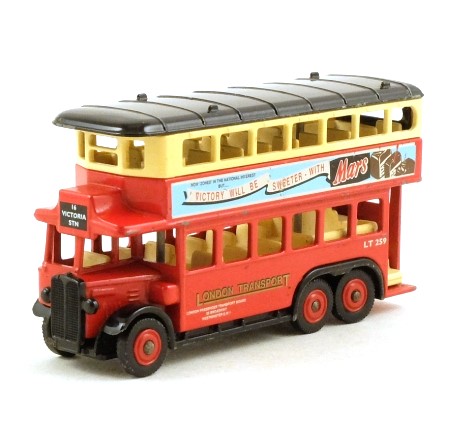 In red with black base, mudguards and radiator, cream plastic interior and upper deck windows, and black metal roof. 'London TRANSPORT' and other lettering on the lower deck sides in gold, black and white. 'VICTORY WILL BE SWEETER WITH MARS' adverts on the upper deck sides, route 16 Victoria Station front destination board. Six red wheels with black tyres.