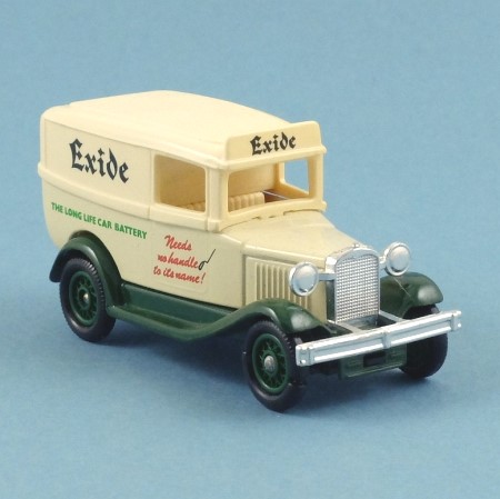 Cream with green chassis and mudguards, and silver plated grille, headlights and bumpers. Black spare wheel cover on the rear. 'Exide' on the sides and header board in black, with lettering below: 'THE LONG LIFE CAR BATTERY' in green and 'Needs no handle to its name!' in red. 20-spoke green plastic wheels with black tyres.