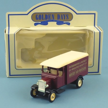 Maroon with light cream roof and interior, black chassis and mudguards, and black plastic baser. Plated gold radiator and headlights. 'PETERBOROUGH & DISTRICT CO_OPERATIVE SOCIETY LTD' and 'GROCERY AND PROVISIONS' on the sides in gold lettering. Wheels are light cream with black tyres.