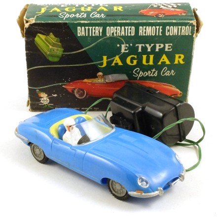 Blue plastic car with yellow and blue interior. Silver bumpers, 'glazed' headlights, amber indicator lights and 'LM 6050' number plate/ White-overalled and helmeted driver figure, black steering wheel. Grey plastic wheels with black tyres. Wired control unit with forward/reverse switch, takes a D size battery.