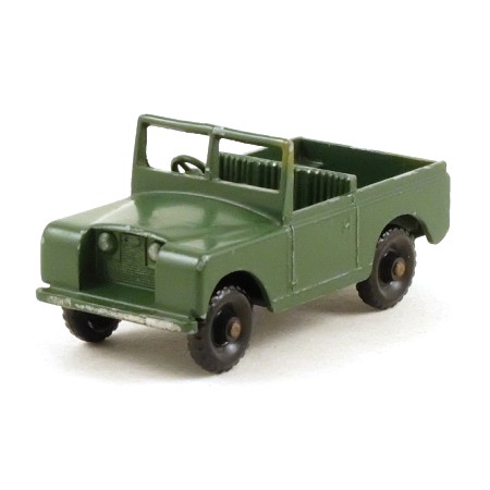 This Land Rover is in military green with black base and tow hook and silver trim to the headlights and front bumper. The wheels are black plastic with 24 treads, on rounded axles.