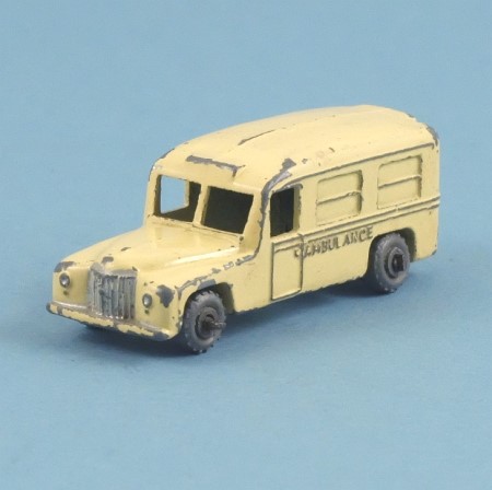 This is the first, smaller version of the Matchbox Daimler ambulance. Cream with silver trim on the grille and headlamps, grey metal wheels on crimped axles.