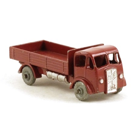 Maroon with silver trim to the grille and headlights. Grey metal wheels on crimped axles.