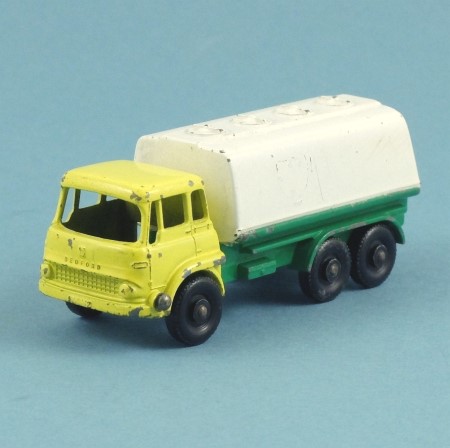 In the BP livery of yellow cab, green chassis and white tank. The cab tilts forward to reveal the engine. The wheels are black plastic and there is a 'BP' decal on one side and rear of the tank in yellow and green..