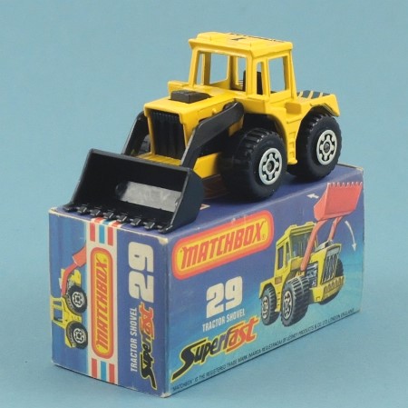 Yellow, black plastic shovel, black engine and cab interior, black plastic base. 'C' and 'CATERPILLAR' tampo print on the roof, black stripe on the rear mudguards. This model's shovel can be raised and lowered, and it has large treaded 'Maltese cross' wheels with silver detailing.