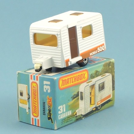 White, with cream interior. Black metal base and amber tinted glazing. Opening side door in dark brown, operated by a thumbwheel beneath the doorstep. Orange and brown stripe tampo print with 'MOBILE 500' in white. Superfast wheels with silver 'dot-dash' hub detailing.