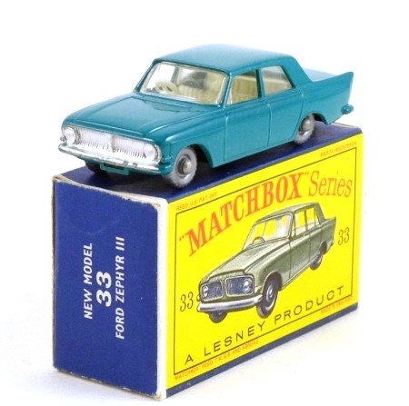 This is a superb example of the MKIII Zephyr, finished in sea green with white interior and black base with tow hook. Wheels are silver plastic and the axles have suspension. This is actually a 'Zephyr 6' which had a straight 6-cylinder engine (there was also a 4 cylinder version). I learned to drive in a Zodiac MKIII which was a more luxurious version of the Zephyr 6. These cars were popular with the UK Police force, and gave the TV cop series 'Z Cars' its name.