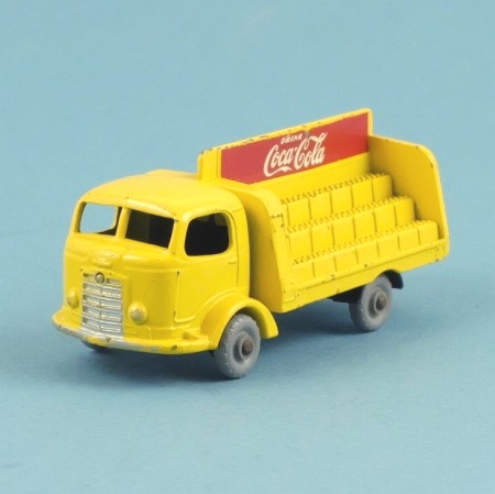 This is the second type of casting, with a black plate chassis incorporating the rear mudguards. In orange-yellow with grey plastic wheels on rounded axles. With 'Coca Cola' decals on the sides and rear, and silver trim to the grille.