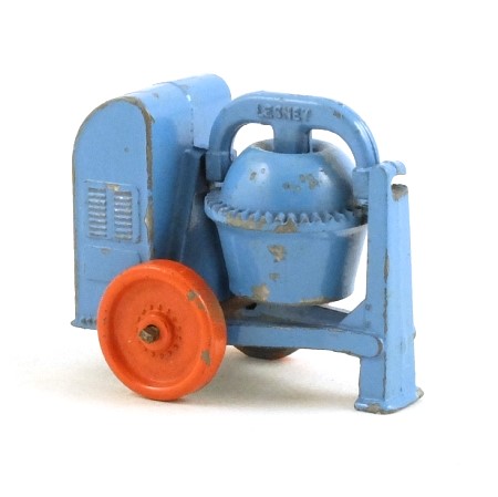 Blue, with orange metal wheels. This example is missing the spoked handwheel from the end of the mixer yoke, and has general moderate paint chipping and some surface rust on the axle.
