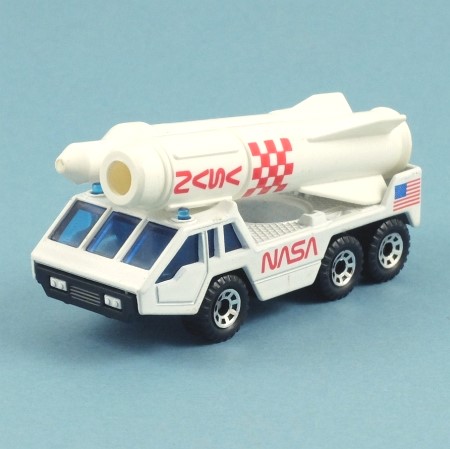 White, with white plastic rocket load in two parts which can be joined together. Blue tinted windows and twin dome lights. 'NASA' in red on the sides with US flag. The rocket has 'NASA' print with chequers. The six wheels have silver 8-spoke centres. Macau casting.