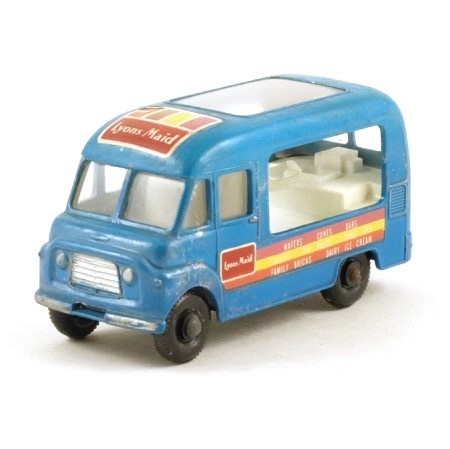 This ice cream van is in mid blue with silver grille, bumper and headlights, and a detailed white interior complete with sales person. The base is black and the wheels are black plastic with fine tread. Colourful 'Lyons Maid' decals on the roof and sides, the roof decal being the later smaller type.