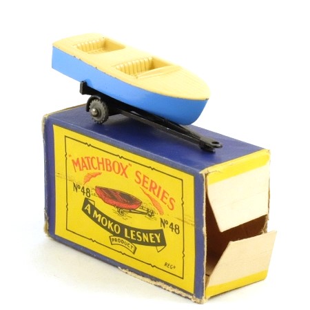 This boat and trailer can be attached to any Matchbox car fitted with a tow hook. The metal boat has a blue hull with buff deck, and can be removed from the black metal trailer. Wheels are grey metal on a crimped axle.