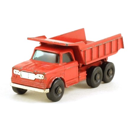 In red, with green tinted windows and silver plated base and grille. With operating tipper. This is the earliest version with the full length silver base without tow guide.. Wheels are black plastic.