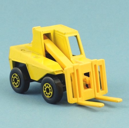 This fork lift is in yellow with black base. The yellow plastic arm can be raised and lowered, with the mechanism keeping the forks horizontal at all times. The wheels have a yellow '5 arches' design.