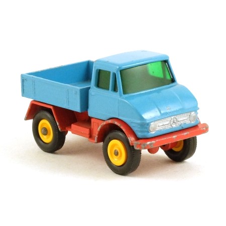 This is the second issue of the Matchbox Mercedes Unimog, in blue with red chassis. Green tinted windows and yellow plastic wheels with black tyres. There is a paint chip on the roof, and some paint loss on the top edge of the rear body sides and the edges of the mudguards. The tow hook is intact.