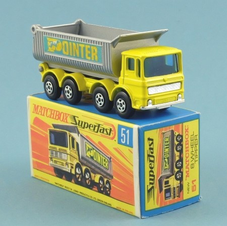 Yellow cab and chassis with blue tinted windows. Chrome plated base, grille and headlights. Silver-grey tipper with built-in support and hinged tailboard. 'Pointer' labels on the tipper sides. Narrow Superfast wheels with 5-spoke chrome hub design and black cover on front axle.