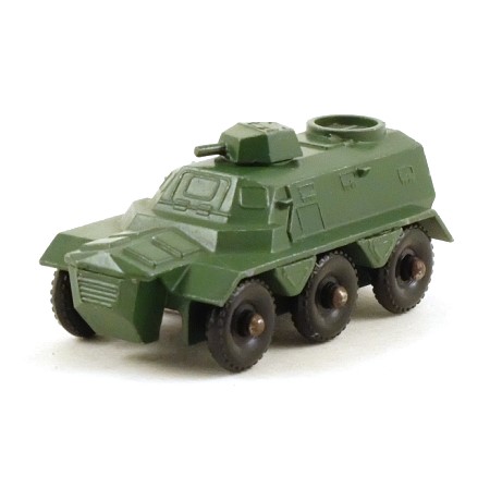 Military green, with rotatable gun turret. Six black plastic wheels with 30 treads, on rounded axles.