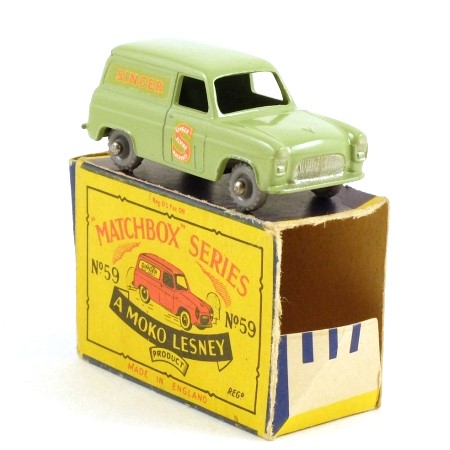 In light green with silver trim to the bumpers, grille and headlights, and black base. 'Singer' decals on the sides and doors in yellow and orange. Grey plastic wheels on crimped axles.
