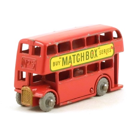 The second version of the ever-popular London bus. In red (of course!) with gold painted radiator. 'Buy Matchbox Series' decals on the upper deck sides. The grey metal wheels are on crimped axles.