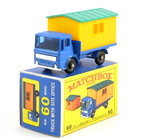 Blue, with chrome plated base/grille and blue tinted windows. Black plastic wheels with suspension. Complete with site hut load; an orange-yellow plastic hut with green roof.